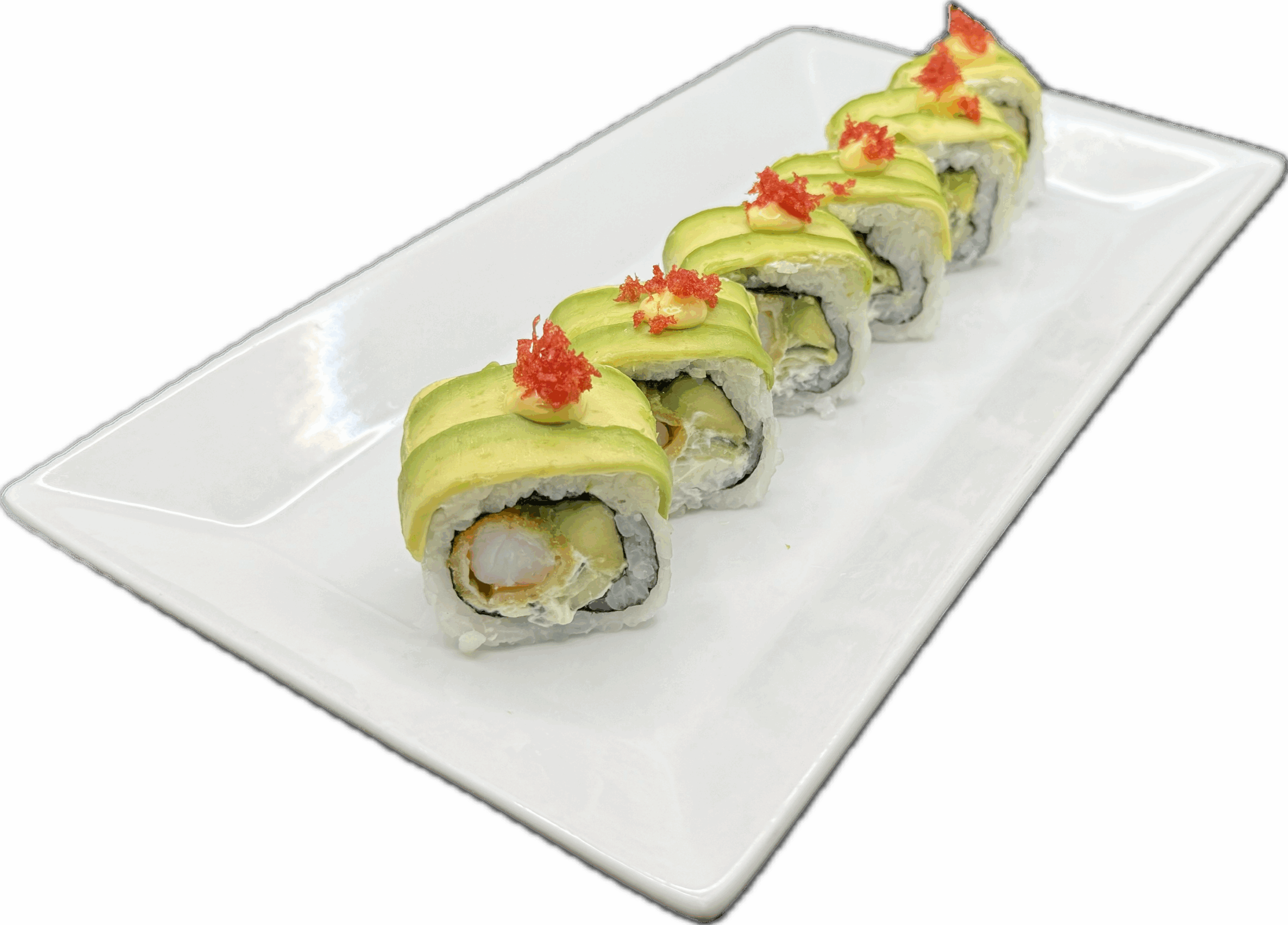 Inneholder fritert scampi, kremost, agurk utenpå avokado