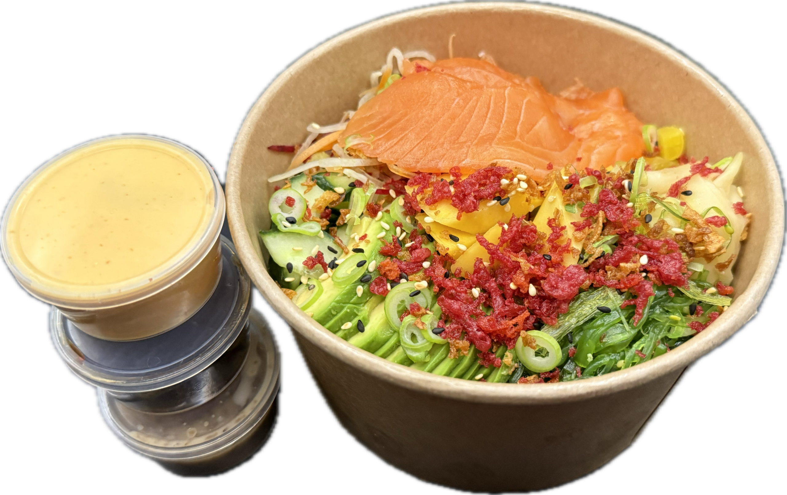 Laks med tare saus, Avokado, agurk, salad, sjøgress, ingefær sesamfrør, vårløk, 200gr sushi ris, leveres med vår egen sushi soya saus og chillimajoyes