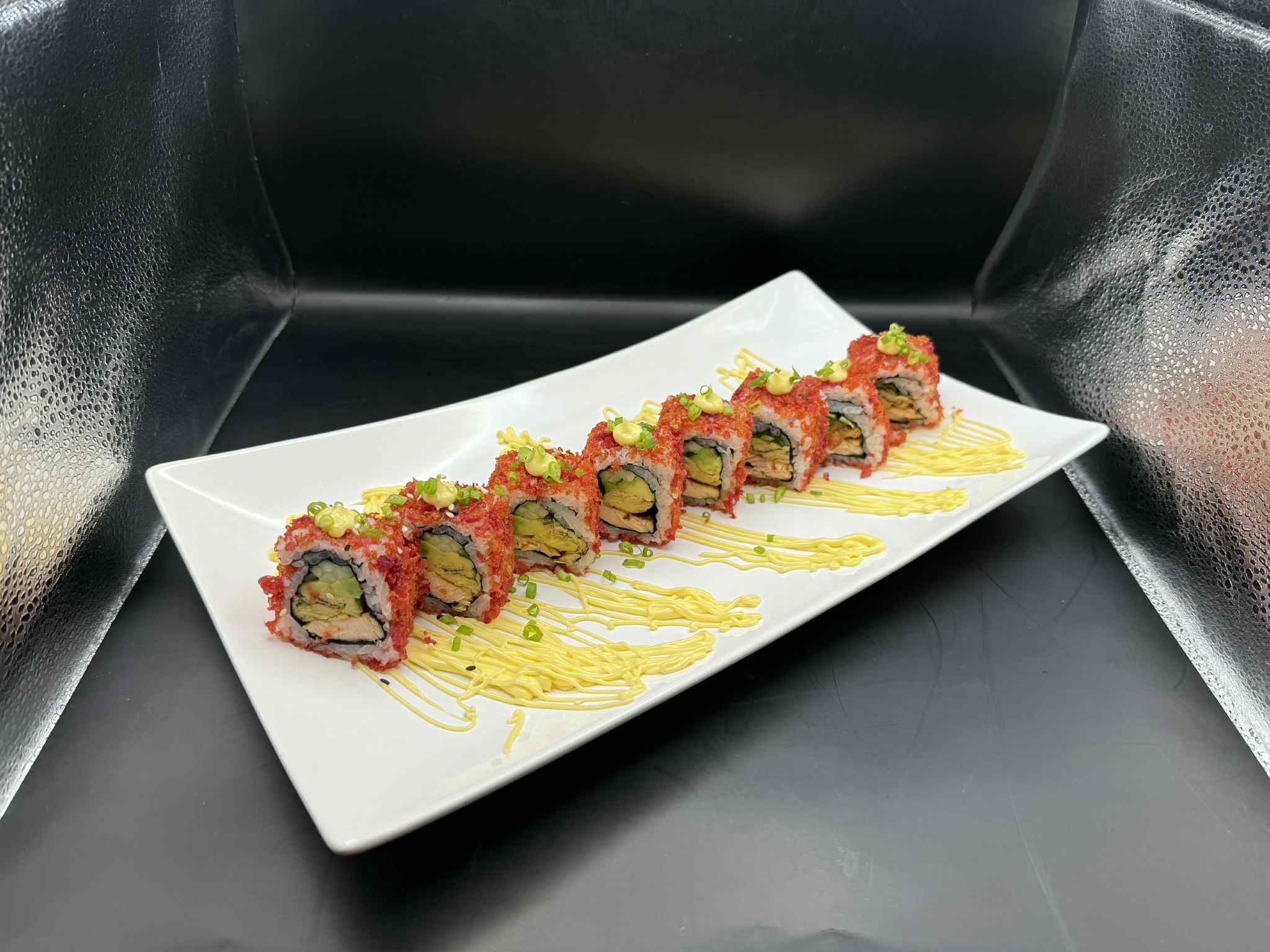 Inneholder: Kokt laks, salat, avokado. Utenpå: rullet i kripsy tempuramel. Topping: rosa saus, tera, vårløk, chilipulver, sesam, rogn ( Passer med rosa saus , majones